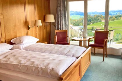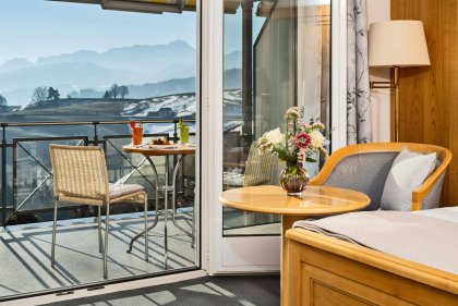 Each room has its own spacious balcony and is characterized by its unique view. Double rooms for single use are available with a view of the valley from CHF 140,- and those who want a little more space can book the Junior Suite from CHF 180,- for single use and CHF 240,- for two people, including breakfast buffet.