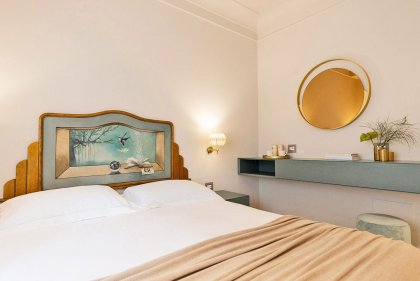 All rooms are all furnished in a unique style, the headboards decorated by hand, with ancient techniques of veiling, gilding and marbling recalling the decorations of the Sicilian Liberty School rediscovering the charm of the Belle Époque. All bathrooms have modern showers decorated with marble and mosaic.