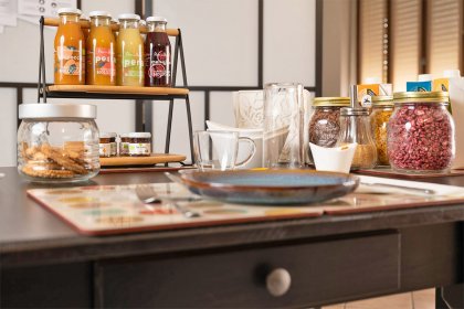 Our rich and varied breakfast is mostly organic and 100% vegan. Breakfast is served in the living room. You will enjoy coffee, tea, various types of plant-based drinks, fresh croissants, toasted bread, jam, plant-based yogurt, cereals, fresh juices and seasonal fruit.