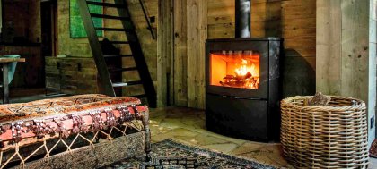 The cabin sleeps four people and features one separate bedroom and a mezzanine above the living room (half-open). The living room features a firestove, a seating area looking out over the forest, and a large dinner table. There’s a fully equipped kitchen, also with a view over the forest. There is one small bathroom with shower.