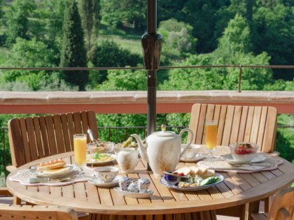 In summer, breakfast is served on the two panoramic terraces surrounded by greenery – with a magnificent view of the surrounding hills.
