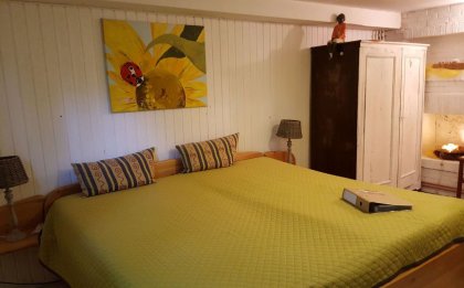 For overnight accommodation, we offer two possibilities. On the lower level, there is a room with double bed and private bathroom with shower. On the upper level, the room has a pullout double bed. This smaller room has its own sink and bathtub, but shared toilet facilities in the hallway.