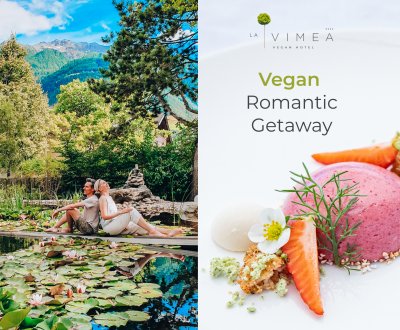 - 2-Night stay package for a couple with gourmet biovegan half-board (Sun Room). Rich vegan breakfast buffet, 5-course gourmet plant-based dinner. Welcome treats in your room: romantic decoration, organic Prosecco and finest vegan chocolate.