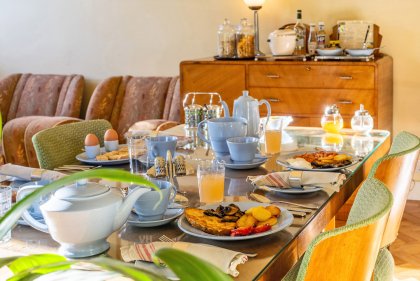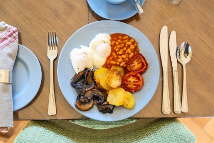 For those staying in the tower – help yourself to – prepared fruits (usually from our garden), organic yoghurt and cereals. On your table a plentiful supply of homemade jam and marmalade, marmite and local apple juice. We will bring your hot drinks and sourdough toast along with your choice of fully cooked veggie or vegan breakfast or something lighter. If you are in the Stirling Suite all these are delivered to you.