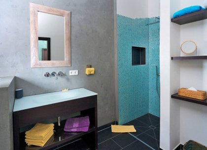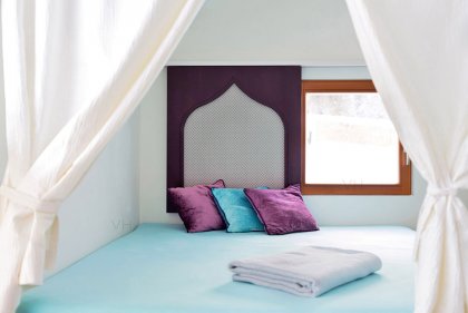 Colourful shimmering star tiles, ample rain shower, gas stove with coffee machine, a cuddle plateau in the living room & a hammock on the terrace.