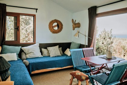 In the main house, a communal area features a cozy living space with a fireplace, an open kitchen and a glass wall with an amazing ocean view.